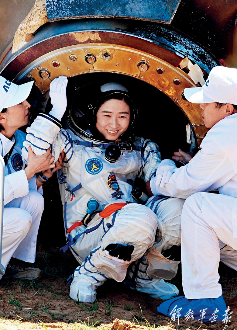 北京時間2012年6月29日,神舟九號載人飛船返回艙順利著陸,航天員劉洋在工作人員的幫助下出艙。(攝影/李 靖)