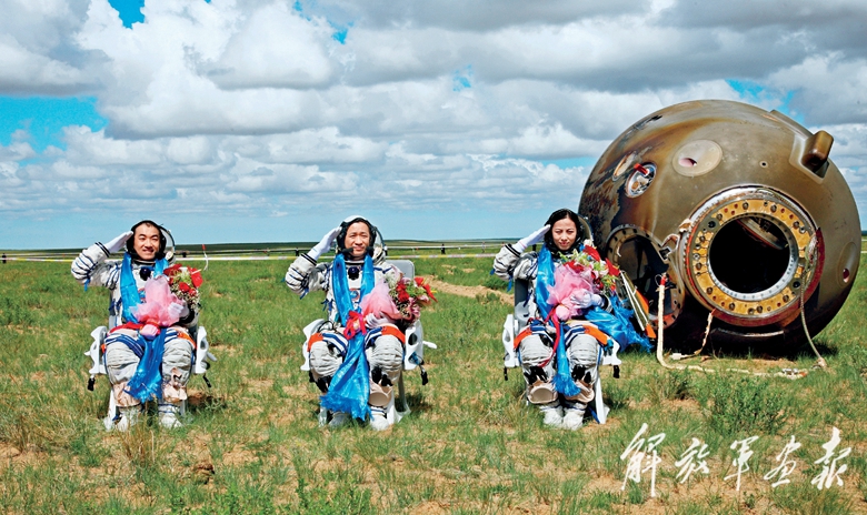 北京時間2013年6月26日,神舟十號航天員乘組圓滿完成任務(wù)返回,航天員張曉光、聶海勝、王亞平(從左至右)自主出艙后行軍禮。(攝影/記者 孫 陽)