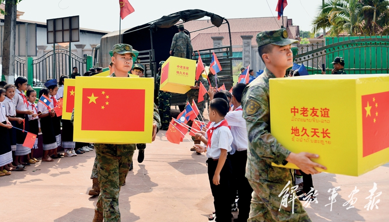 中方參演官兵到中老友好農(nóng)冰村小學(xué)開展捐贈活動。