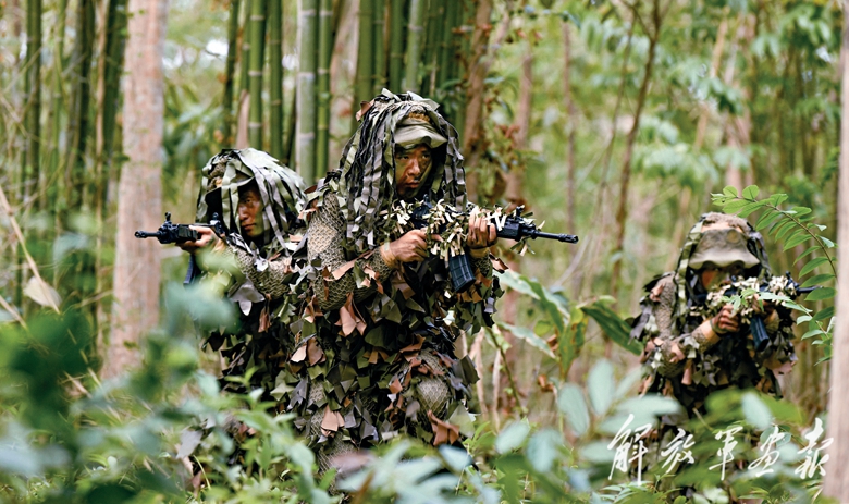 參演官兵在山林地域進行偵察訓(xùn)練。