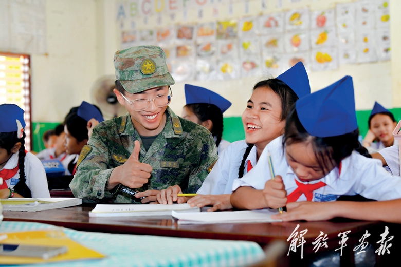 中方參演官兵教中老友好農(nóng)冰村小學(xué)的學(xué)生寫漢字。
