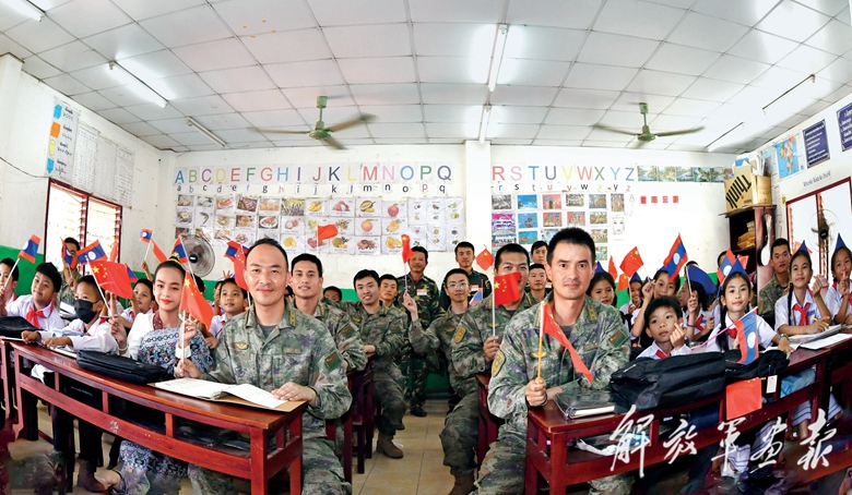 中方參演官兵與中老友好農(nóng)冰村小學(xué)學(xué)生合影。