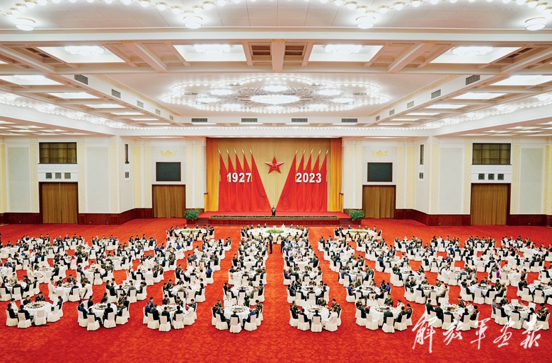 人民大會(huì)堂氣氛熱烈,中外嘉賓歡聚一堂。主席臺(tái)帷幕正中莊嚴(yán)的“八一”軍徽熠熠生輝,10面紅旗分列兩側(cè)。“1927-2023”的大字年號(hào),昭示著中國人民解放軍走過96年的光輝歷程。