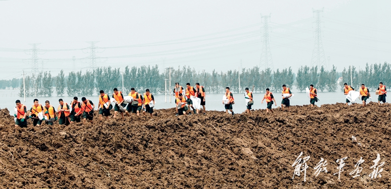 洪水滔滔,一路東流,在有著“九河下梢”之稱的天津入海。堤壩上,子弟兵滿身泥濘、挺立如山,目送洪峰遠(yuǎn)去。