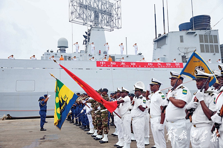 7月8日,海軍第43批護(hù)航編隊(duì)抵達(dá)加蓬進(jìn)行友好訪問(wèn)。圖為加方在利伯維爾奧文多港碼頭舉行儀式,歡迎中方艦艇到訪。
