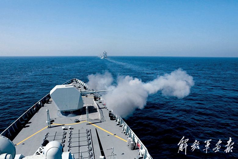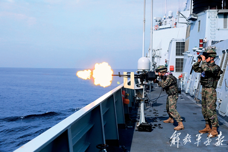 3月14日,海軍第43批護(hù)航編隊(duì)參加“安全紐帶-2023”海上聯(lián)演。圖為官兵對(duì)目標(biāo)進(jìn)行攔阻射擊。