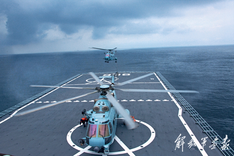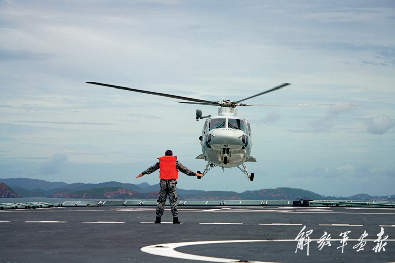 參訓(xùn)官兵進(jìn)行直升機(jī)互降課目訓(xùn)練,泰方直升機(jī)降落在中方艦艇上。