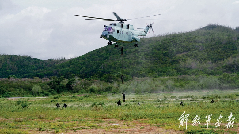 兩國(guó)參訓(xùn)官兵進(jìn)行混編滑降訓(xùn)練。