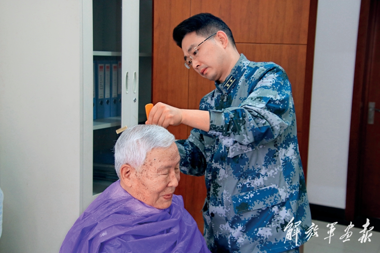 在干休所工作期間,周昆訓(xùn)為老干部理發(fā)。(攝影/張 迪)