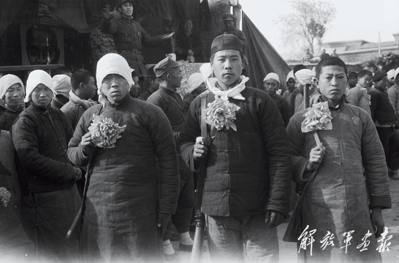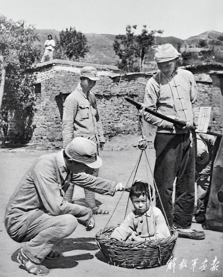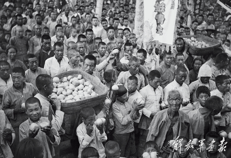 1939年,河北阜平一區(qū)參軍大會上,群眾給參軍青年家屬送饅頭。