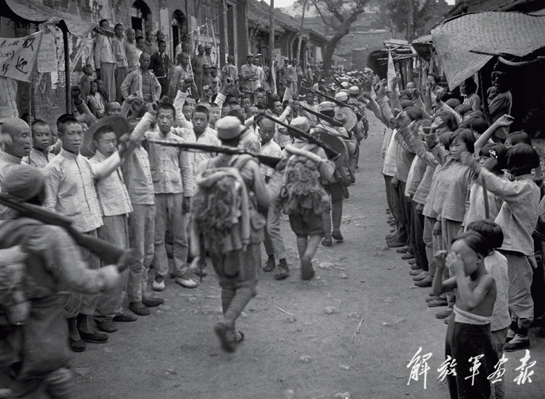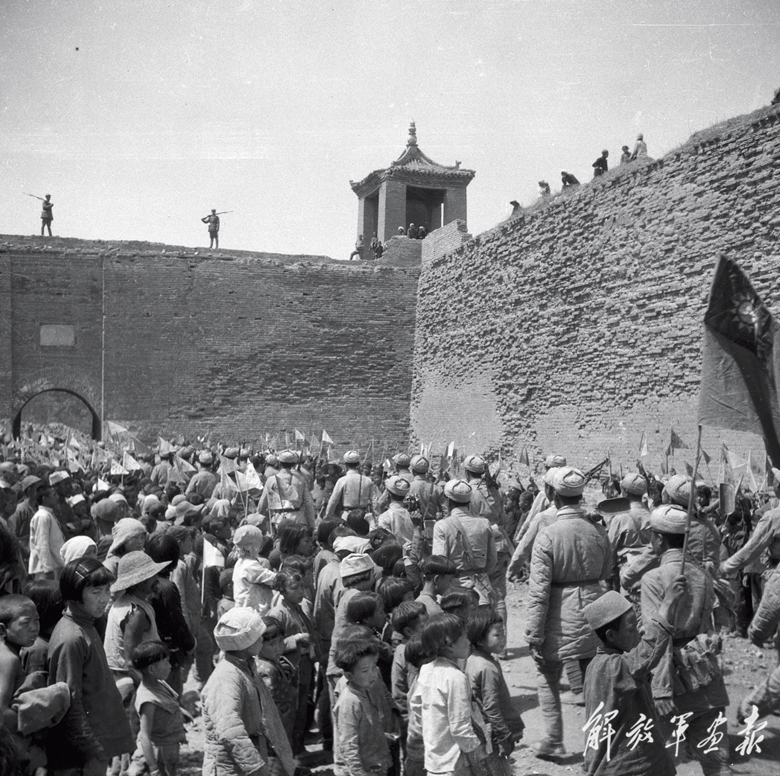 1945年3月,靈丘人民熱烈歡迎八路軍入城。