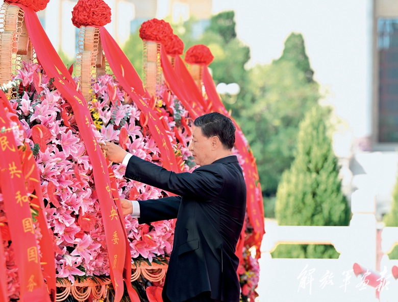 9月30日上午,黨和國家領(lǐng)導人習近平、李強、趙樂際、王滬寧、蔡奇、丁薛祥、李希、韓正等來到北京天安門廣場,出席烈士紀念日向人民英雄敬獻花籃儀式。這是習近平整理花籃上的緞帶。(攝影/新華社記者 殷博古)