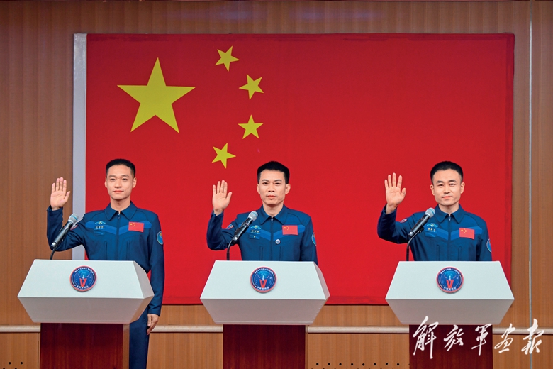 10月26日上午,神舟十七號(hào)載人飛行任務(wù)航天員乘組出征儀式在酒泉衛(wèi)星發(fā)射中心問(wèn)天閣圓夢(mèng)園廣場(chǎng)舉行。這是航天員湯洪波(右)、唐勝杰(中)、江新林在出征儀式上。(攝影/記者 王 ?。?/span>