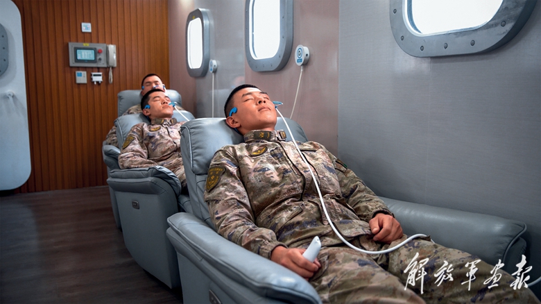 吃好每頓飯,在邊防部隊已不是新鮮事。對第一次走上高原的官兵來說,最擔心的是缺氧。筆者在海拔4700多米的某邊防連看到,剛走下哨位的戰(zhàn)士們進入微壓氧艙進行休整??匆粫簳?,聽一會兒音樂,幾名戰(zhàn)士很快進入夢鄉(xiāng)。