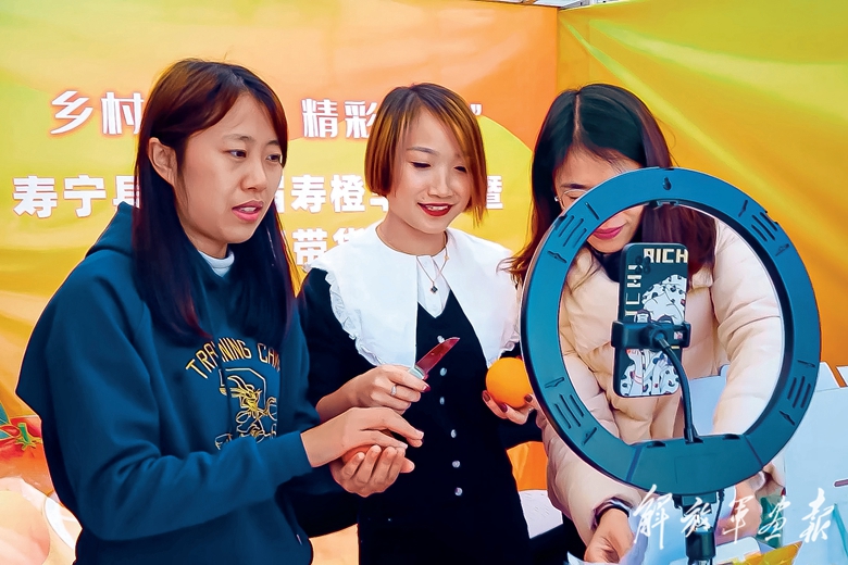 村民通過(guò)直播帶貨方式銷(xiāo)售“紅美人”柑橘。
