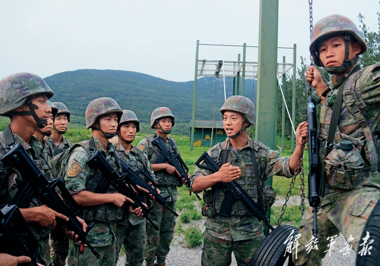 排長(右二)為戰(zhàn)士講解通過障礙技巧。