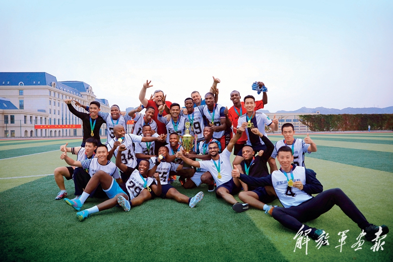 參加國(guó)際學(xué)員周活動(dòng)的學(xué)員組織足球友誼賽,奪冠隊(duì)伍慶祝勝利。
