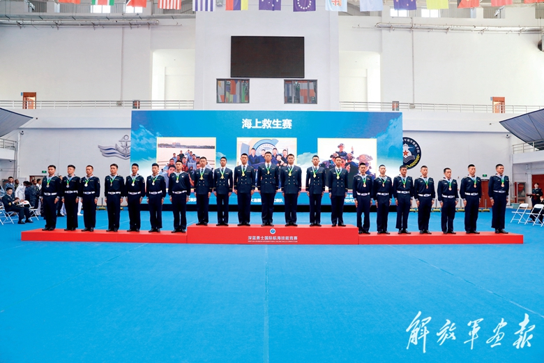 在海上救生賽中獲獎(jiǎng)的學(xué)員上臺(tái)領(lǐng)獎(jiǎng)。