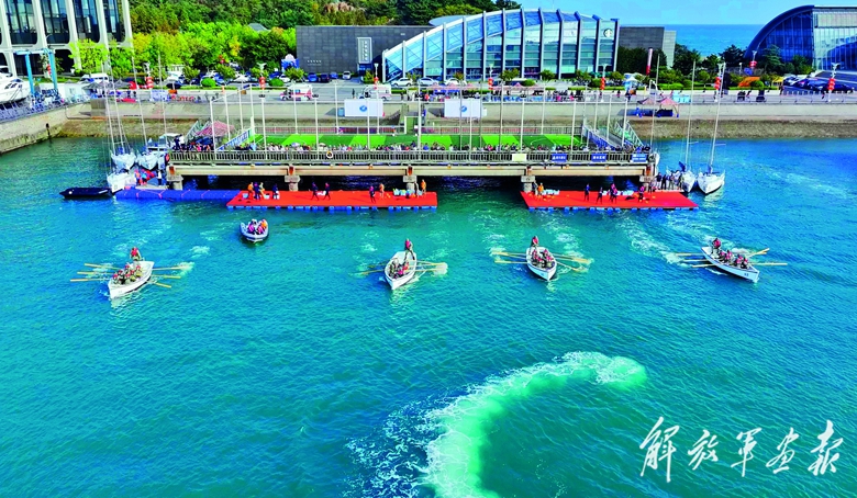 第一屆“深藍(lán)勇士”國(guó)際航海技能競(jìng)賽上,外國(guó)海軍學(xué)員參加舢舨賽。