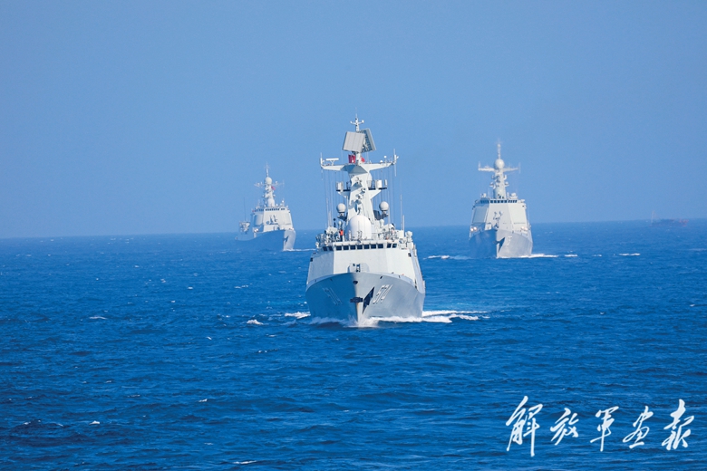 1月初,南部戰(zhàn)區(qū)海軍某驅(qū)逐艦支隊(duì)艦艇編隊(duì)破浪前行,向訓(xùn)練海域挺進(jìn)。(攝影/溫 彬)