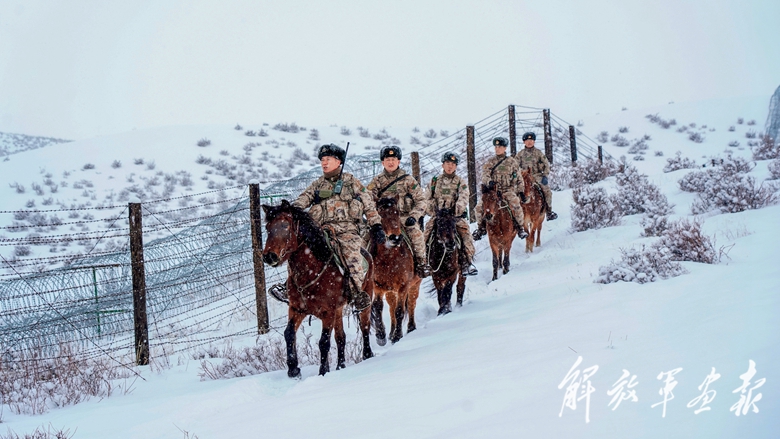 新疆軍區(qū)某邊防團(tuán)小白楊哨所官兵騎馬巡邏,確保邊境安全穩(wěn)定。(攝影/李 峰)
