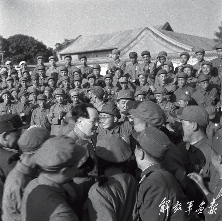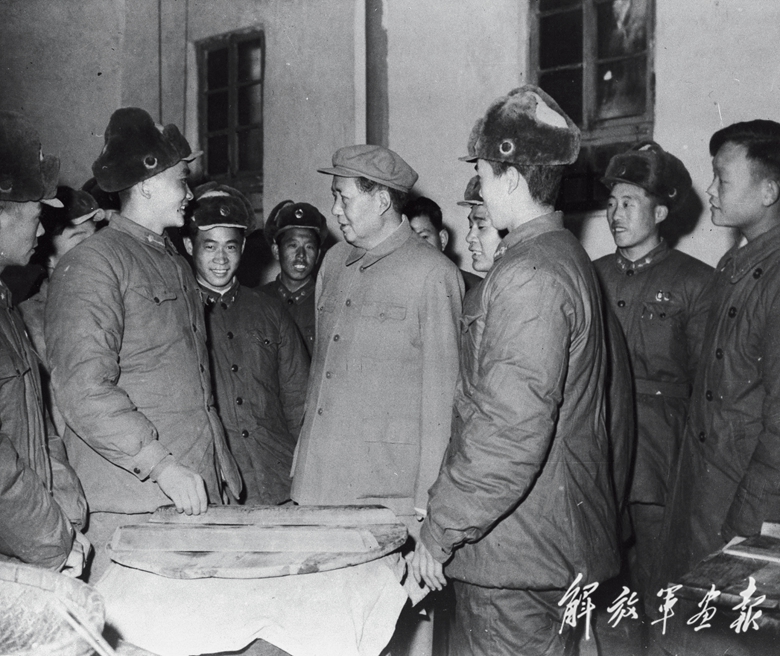 1958年,毛澤東同志在中央警衛(wèi)部隊(duì)某部炊事班和戰(zhàn)士們親切交談。