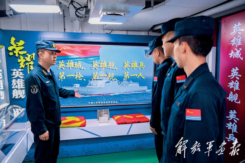 “英雄城、英雄艦、英雄兵,第一槍、第一艦、第一人。”走在南昌艦主通道,當年由首批艦員共同創(chuàng)作的這副對聯(lián)赫然映入記者眼簾,一股英雄氣直擊心靈。這18個大字,如今已成為南昌艦艦訓,融入全艦官兵血脈,像一面旗幟高高飄揚,持續(xù)激發(fā)奮斗強軍的強大精神動力。