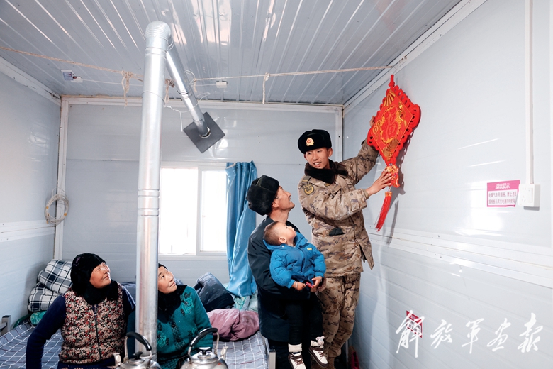 2023年12月31日,武警戰(zhàn)士為臨時安置點的群眾家中掛上中國結(jié),迎接新年的到來。