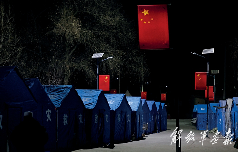 2023年12月20日,受災群眾在官兵幫助搭建的帳篷里過夜。