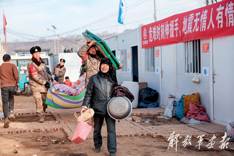 2023年12月28日,官兵幫助受災群眾向活動板房轉(zhuǎn)移物資。
