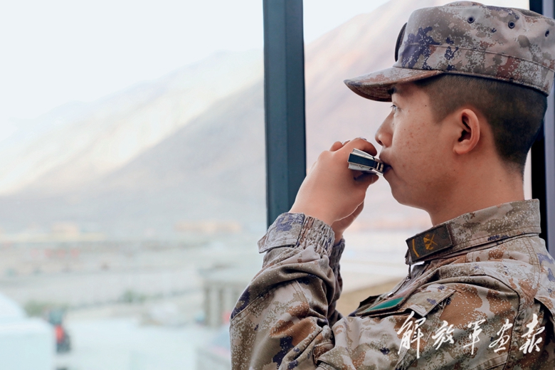 戰(zhàn)士何坤吹奏口琴,寄托對(duì)家鄉(xiāng)的思念。