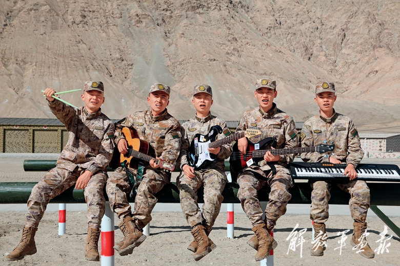 “雪山戈壁酷暑嚴(yán)寒/信息無聲流淌你我之間/五湖四海西北東南/離家萬里又相聚在邊關(guān)……”夕陽下, 5名官兵正在投入地演唱最新創(chuàng)作的歌曲。他們,就是深受邊關(guān)戰(zhàn)友喜愛的“山河樂隊(duì)”。