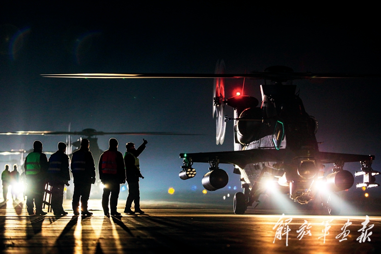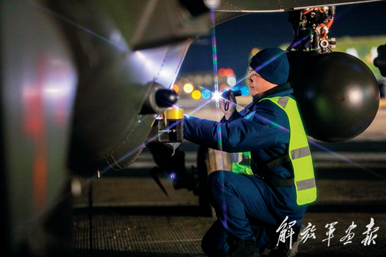 夜間飛行訓練前,機務官兵仔細檢查戰(zhàn)機。