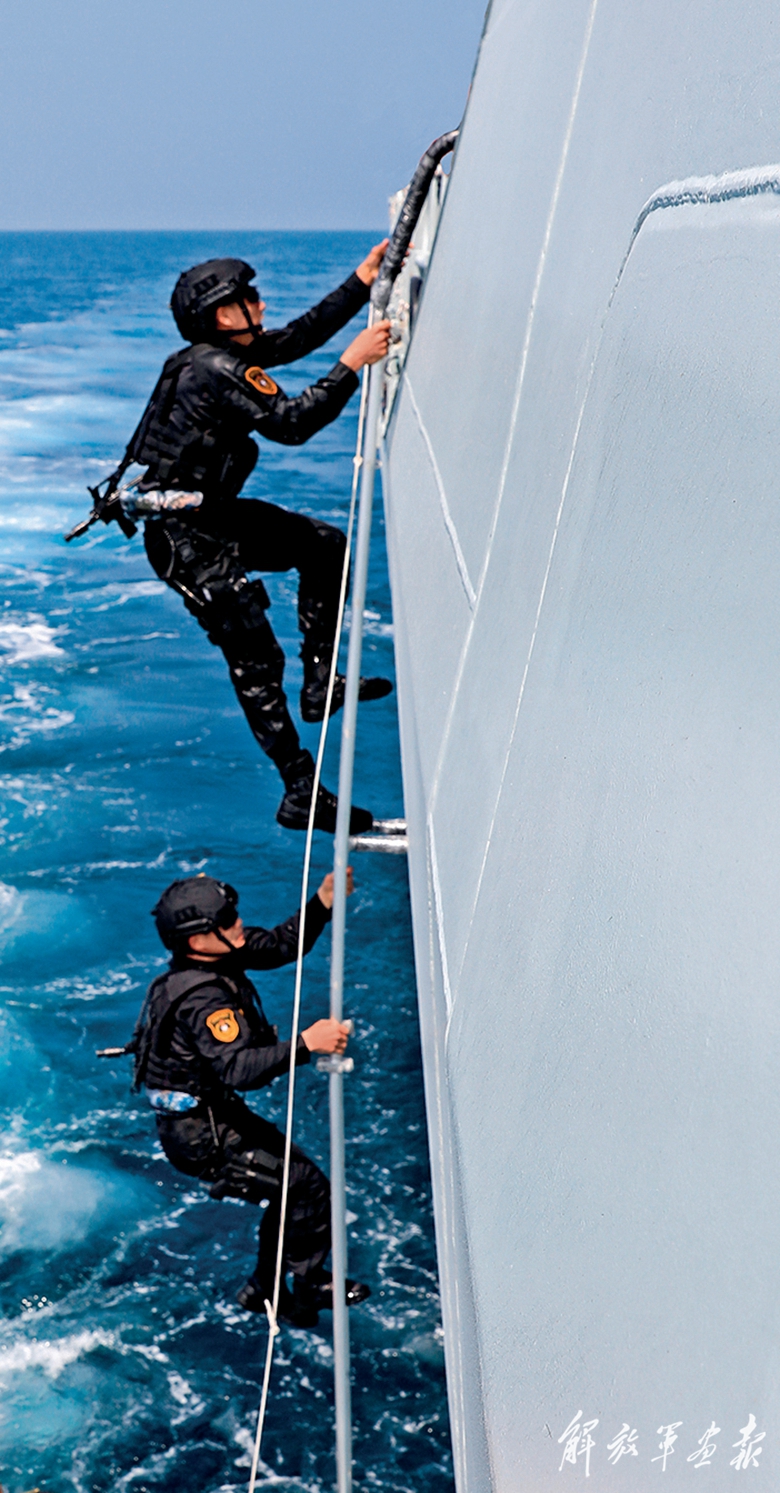 特戰(zhàn)隊(duì)員在航行中進(jìn)行攀爬訓(xùn)練。