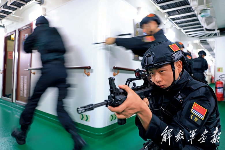 特戰(zhàn)隊(duì)員進(jìn)行艙室搜索訓(xùn)練。