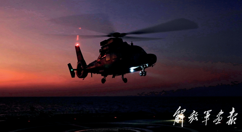 艦載直升機(jī)進(jìn)行夜間起降訓(xùn)練。