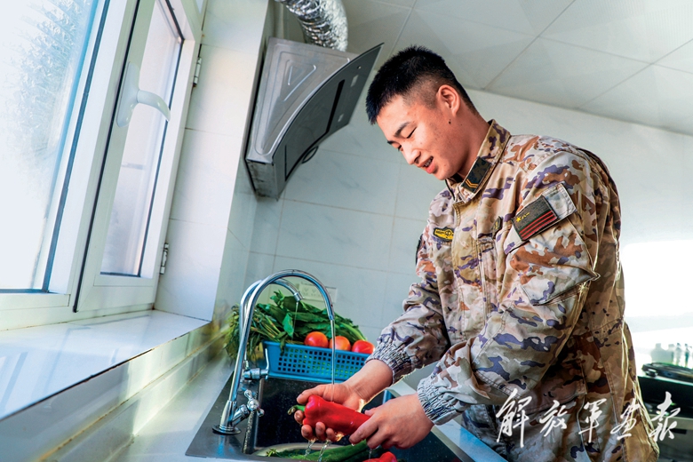 哨所戰(zhàn)士用凈化處理后的井水清洗蔬菜。