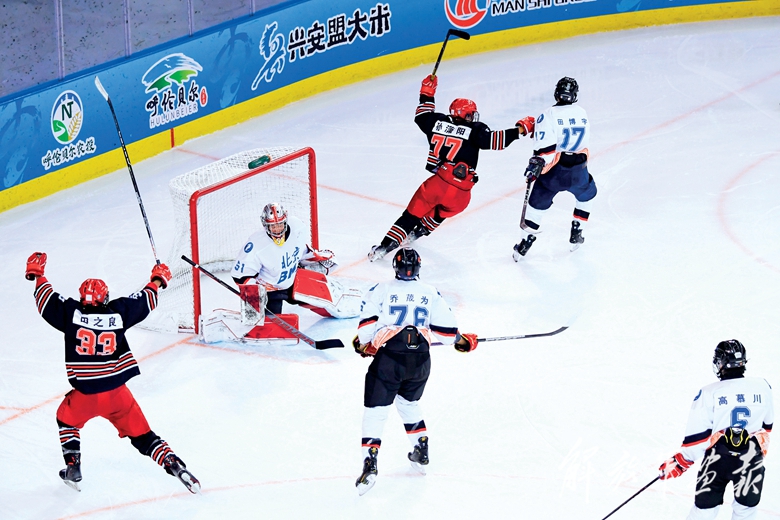 2月27日,第十四屆全國冬季運動會冰球項目男子青年組決賽在內(nèi)蒙古冰上運動訓(xùn)練中心冰球冰壺館舉行。圖為黑龍江隊球員慶祝進球得分。