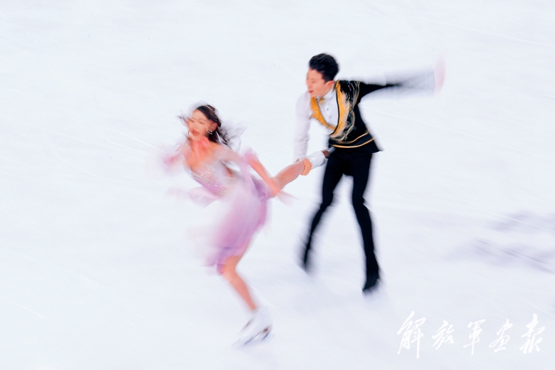 2月26日,第十四屆全國冬季運動會花樣滑冰(公開組)冰上舞蹈自由舞比賽在內(nèi)蒙古冰上運動訓(xùn)練中心短道速滑館舉行。圖為廣東隊組合肖紫兮(左)、何凌昊在比賽中。