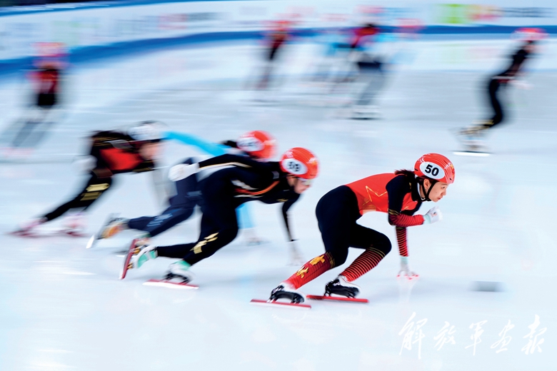 2月17日,第十四屆全國冬季運動會短道速滑(公開組)女子3000米接力半決賽在內(nèi)蒙古冰上運動訓(xùn)練中心短道速滑館舉行。圖為參賽選手在比賽中。