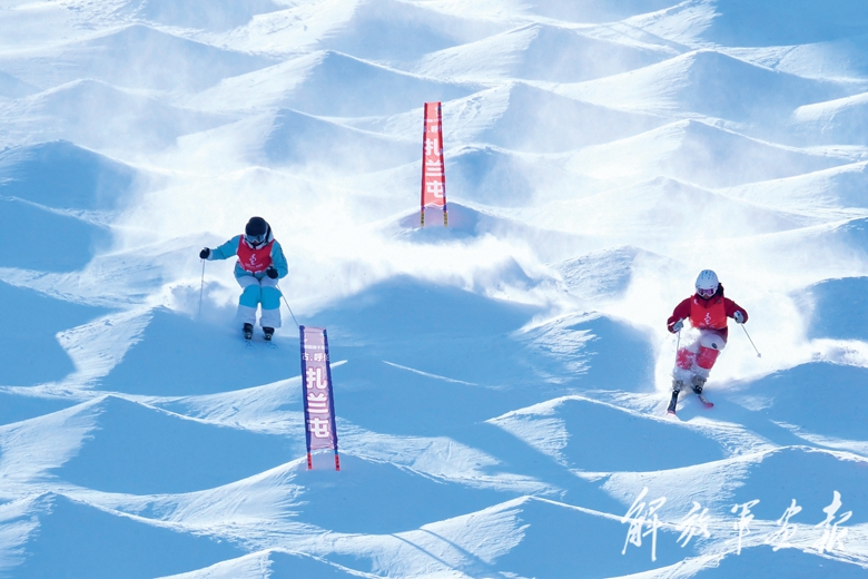 2月19日,第十四屆全國冬季運動會自由式滑雪公開組女子雙人雪上技巧比賽在扎蘭屯金龍山滑雪場舉行。圖為參賽選手在比賽中。