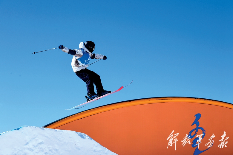 2月22日,第十四屆全國冬季運動會自由式滑雪公開組男子坡面障礙技巧比賽在扎蘭屯金龍山滑雪場舉行。圖為貴州隊選手劉鑫鵬在比賽中。