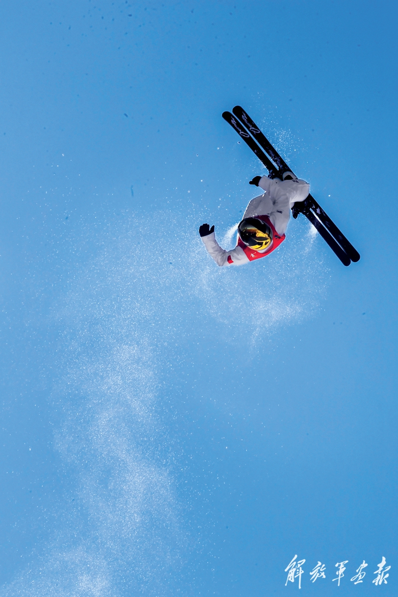 2月21日,第十四屆全國冬季運動會自由式滑雪公開組女子空中技巧比賽在扎蘭屯金龍山滑雪場舉行。圖為黑龍江隊選手孔凡鈺在比賽中。