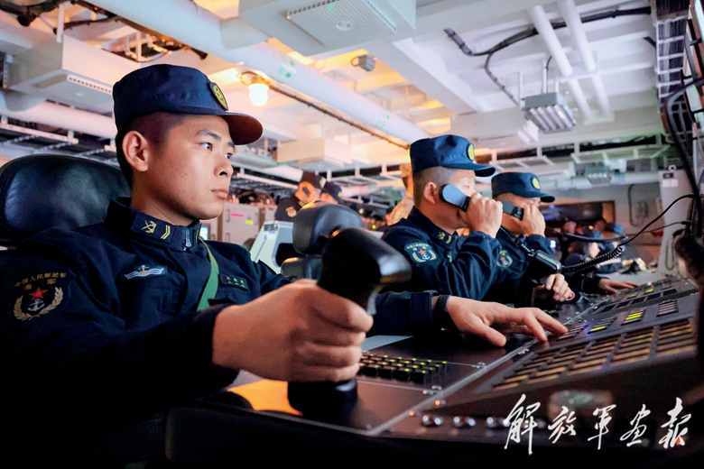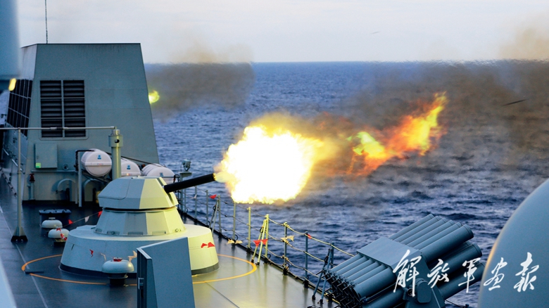 五指山艦作戰(zhàn)指揮室內(nèi),屏幕閃爍,鍵盤聲此起彼伏。艦艇快速占領(lǐng)有利陣位,當(dāng)目標(biāo)進(jìn)入副炮射程后,指揮員立即下達(dá)開(kāi)火命令,炮彈呼嘯而出,直擊海上目標(biāo)。