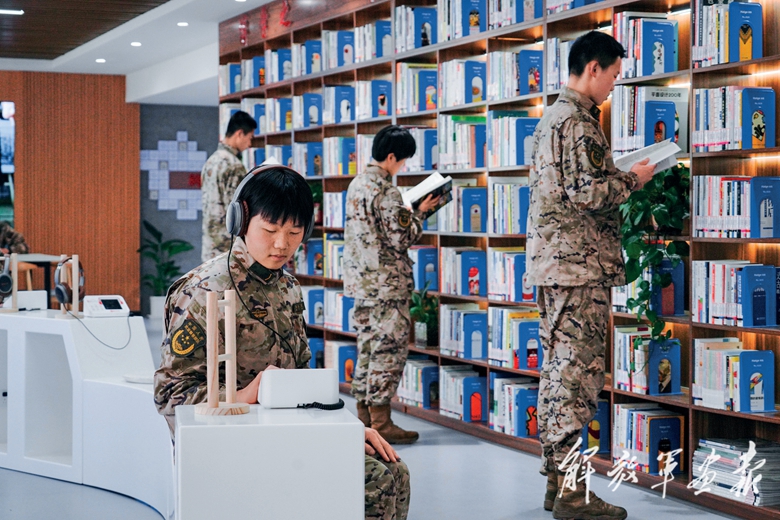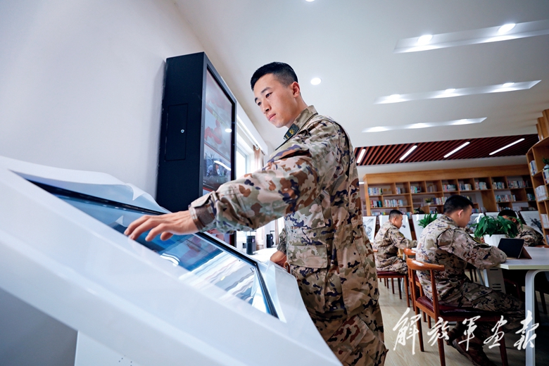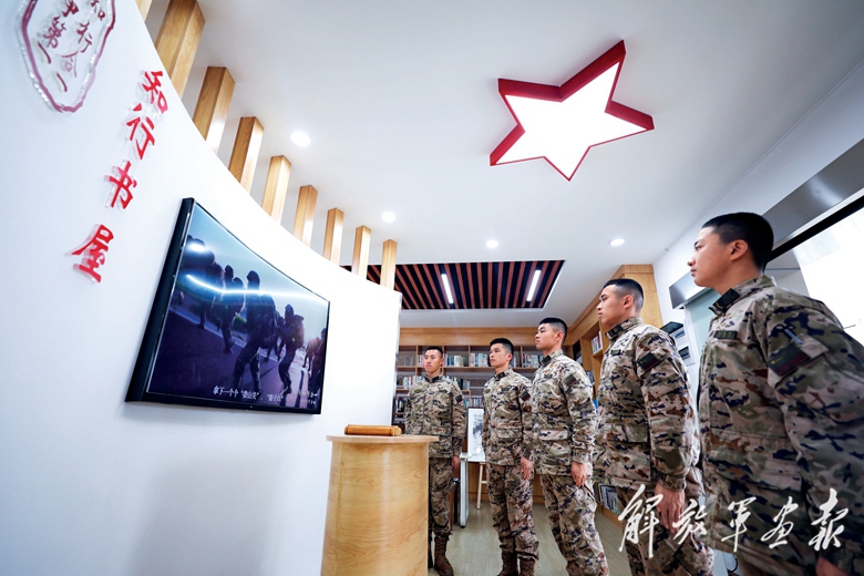 官兵在“知行書屋”觀看戰(zhàn)友制作上傳的短視頻。