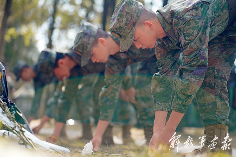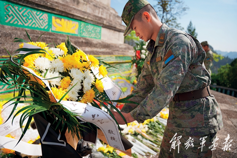 戰(zhàn)士為烈士敬獻(xiàn)鮮花。