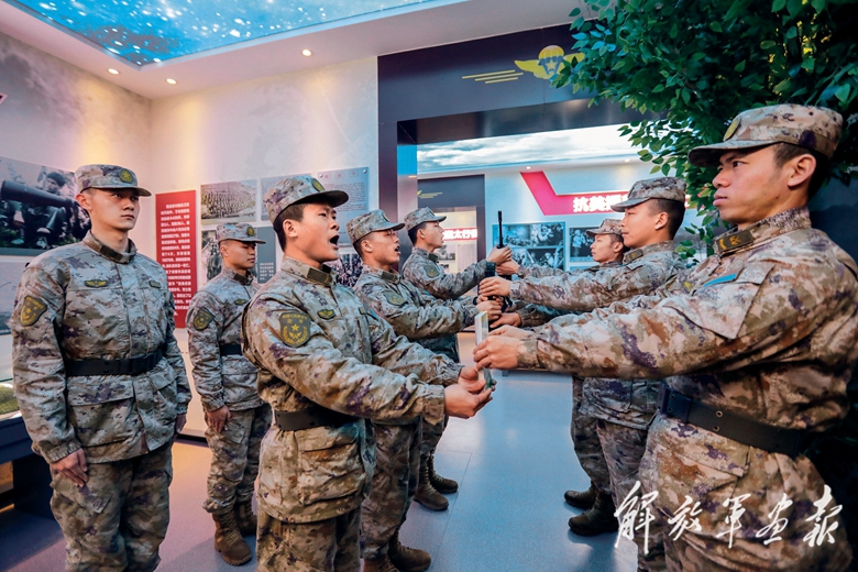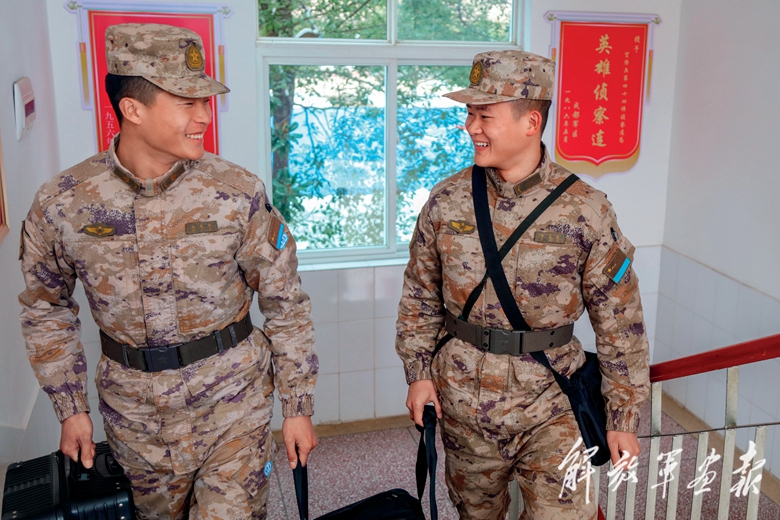 李英杰(右)與戰(zhàn)友交流。