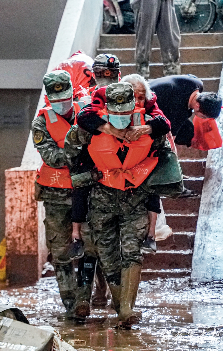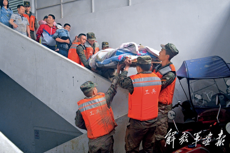 4月21日,火箭軍某部官兵轉(zhuǎn)移受災(zāi)群眾。(攝影/張 峰)