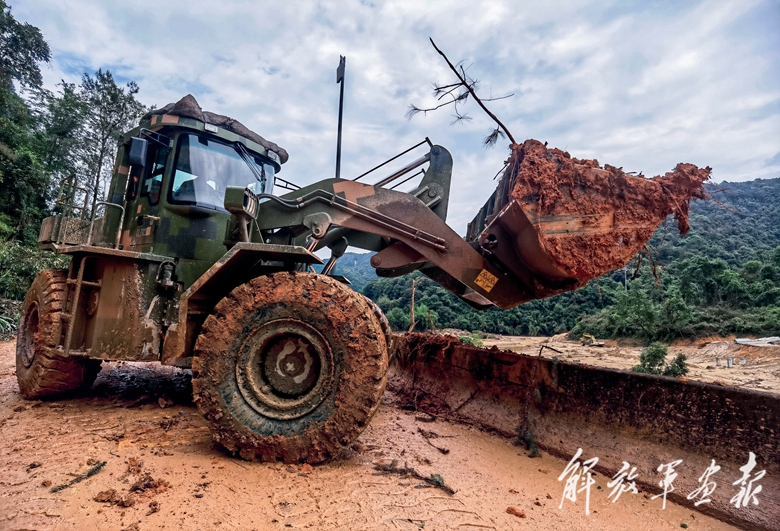 4月21日,陸軍第74集團(tuán)軍官兵利用大型工程機(jī)械車清理道路淤泥。(攝影/王云勇)