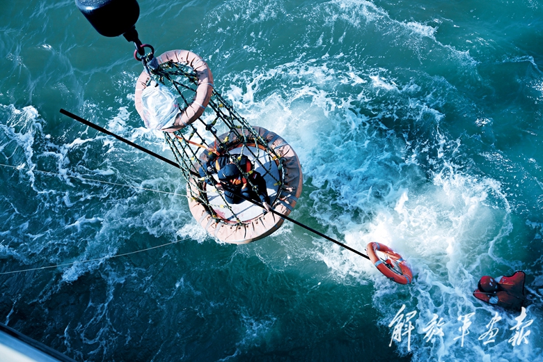 艦艇吊放救生吊籃營救“落水人員”。